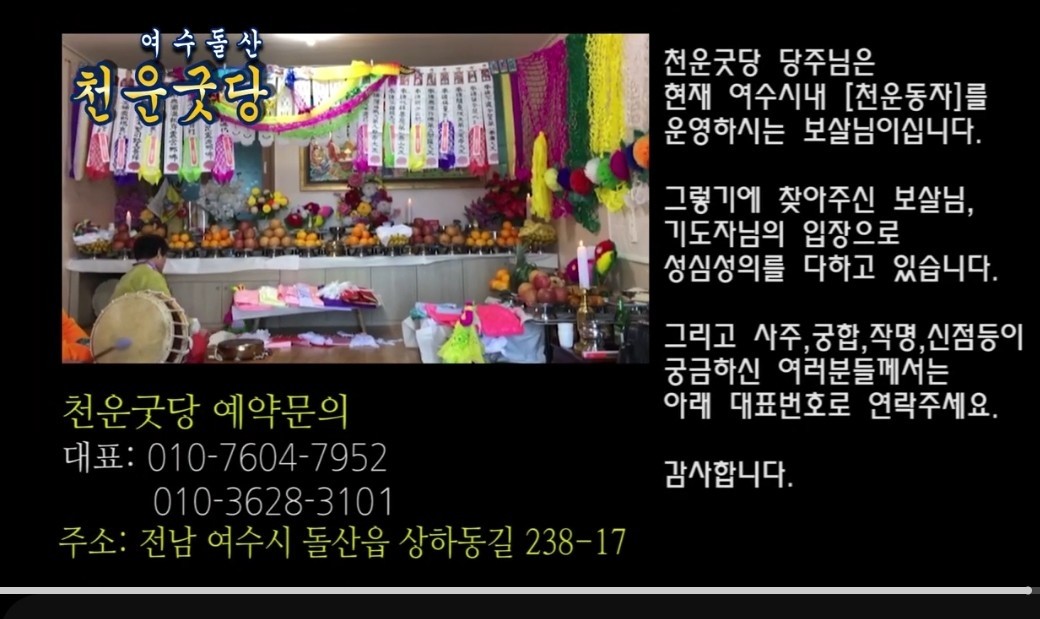 네이버 무속나라 밴드 (2025-09-07) 성수청 0 211 09.07 12:20 #기도터 #여수#천운굿당전남 여수시 돌산읍 상하동길238-170107604785201036283102 #굿당/기도터 바다가 보이는 여수 천운굿당https://youtube.com/watch?v=3AL0VliCJzk&si=omqjIncZdTFWIQYD